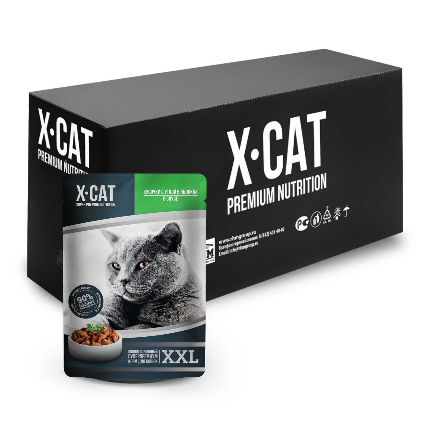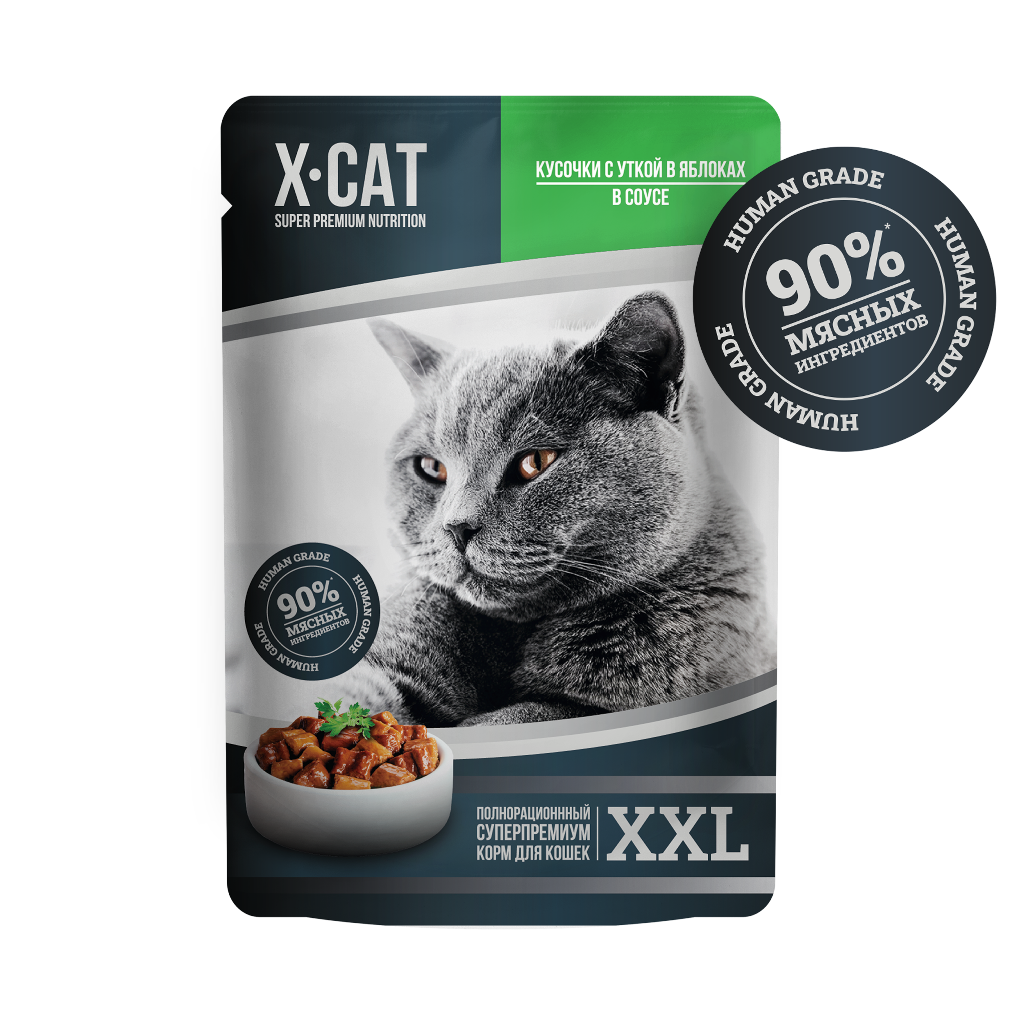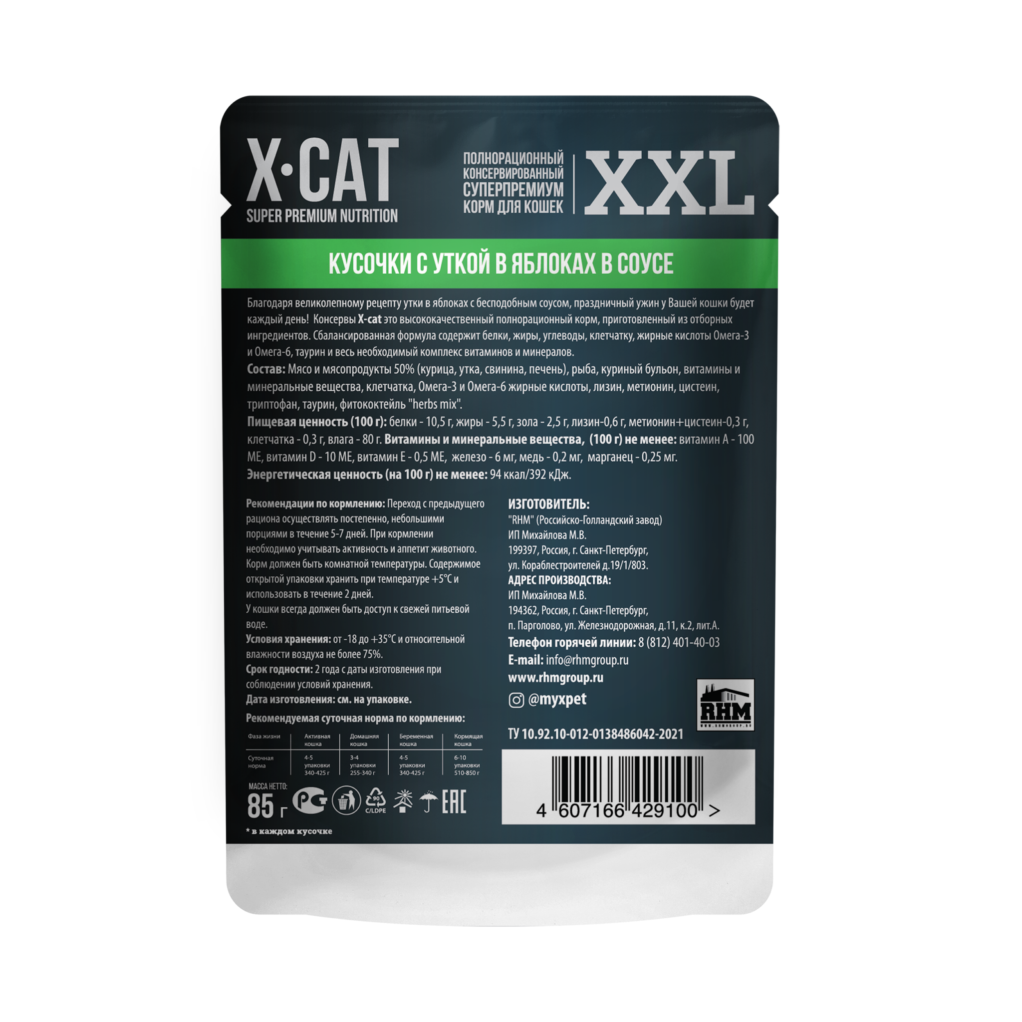 Благодаря великолепному рецепту утки в яблоках с бесподобным соусом, праздничный ужин у Вашей кошки будет каждый день! Консервы X-CAT — это высококачественный полнорационный корм, приготовленный из отборных ингредиентов. Сбалансированная формула содержит белки, жиры, углеводы, клетчатку, жирные кислоты Омега — 3 и Омега — 6, таурин и весь необходимый комплекс витаминов и минералов.